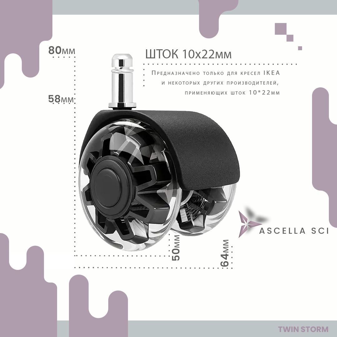 Способы оплаты Колеса для офисного и игрового кресла диаметр штока 10 мм TWIN STORM Ascella SCI: